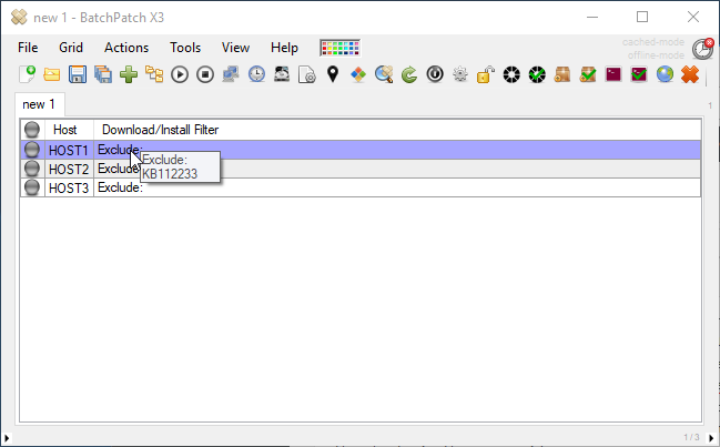 - First we need to create a row template for our grid. For the sake of this example we will create a row template that will include an exclusions for update KB112233, so that KB112233 is never installed on computers that are added to this grid. In our grid we have 3 hosts to start. Create a Windows Update exclusion filter by selecting the rows and then clicking ‘Actions > Windows updates > Filter which available updates are included or excluded when downloading/installing > Exclude specific updates (textual)…’